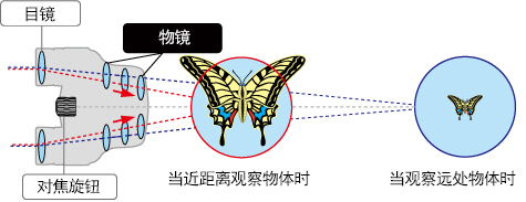 可根据对焦距离移动物镜。这种独特的机构,让用户能更舒适地近距离观察物体,而不会感到眼睛疲劳。由于物镜在远距离观察时会恢复到初始位置